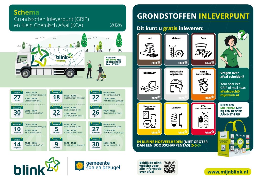 Good news: waste collector Blink's Raw Materials Collection Point (GRIP) will be coming to Son en Breugel on March 27, 2026. The GRIP is a mobile collection point. You can drop off various types of waste here, such as small electrical appliances, empty batteries, metals, and wood. This makes dropping off these raw materials easy, convenient, and saves time and effort. Upon presentation of your environmental pass, you can drop off one shopping bag of waste per visit.