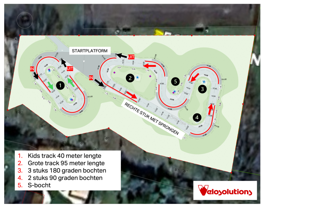 The pumptrack will soon have 2 separate tracks. A track for the smallest with 2 180 degree turns. On the straights, the track has height differences to make some speed, with a total length of 40 meters. The curve height is 0.60 cm. The other track is intended for older and more experienced children. This track has 3 180-degree turns and 2 90-degree turns. It also has an S-curve. The curves are 1.30 m high with height differences on the straights to build up speed.